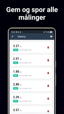 Udover kernemålefunktionaliteten er appen designet med brugervenlighed og funktionalitet i højsædet. Med funktionen 'Historik' kan du nemt gennemgå, administrere og slette alle dine gemte målinger, så du aldrig mister vigtige data. Tilpas din oplevelse i 'Indstillinger', hvor du kan vælge din foretrukne måleenhed (meter, centimeter, fod, tommer, yards eller millimeter), aktivere automatisk lagring, justere lyd- og vibrationsfeedback og tilføje et praktisk gitteroverlay eller niveauindikatorer for optimal justering. Du kan også altid tjekke din enheds specifikke målekapacitetsniveau under 'Engine Tier'. Denne app er mere end blot et måleværktøj – det er din pålidelige partner for præcision i hverdagen.