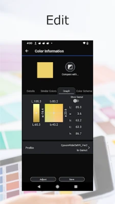 Med Epsons banebrydende sensorteknologi tilbyder appen højpræcise farvemålinger med et enkelt tryk. De indsamlede farver kan visualiseres i et væld af farverum, herunder Lab, LCh, RGB, CMYK og LRV, hvilket giver dig et omfattende overblik. Foruden den grundlæggende visning kan appen intelligent søge og vise tilnærmede farver fra den integrerede PANTONE® farvekollektion og endda foreslå harmoniske farvekombinationer, der komplementerer din valgte nuance.
