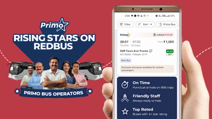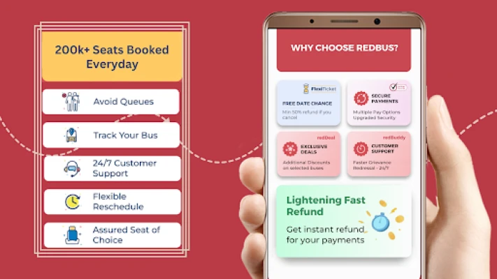 Med redBus er det nemt at booke din bustur. Få billetter på kun tre trin og nyd fleksibiliteten med gratis ombooking op til 8 timer før afgang med FlexiTicket. redBus garanterer en problemfri oplevelse med lynhurtige refusioner, 24/7 kundesupport og adgang til 'Primo Certified Buses', der sikrer en premium rejse med topbedømte busser og venligt personale. Vælg mellem et bredt udvalg af bustyper, herunder sovebusser, sæder, semi-sovebusser og luksuriøse AC Volvo-busser. Hold dig opdateret undervejs med live-sporing direkte på dit Wear OS smartwatch, som giver dig realtidsopdateringer og haptiske advarsler for dine aktive rejser.