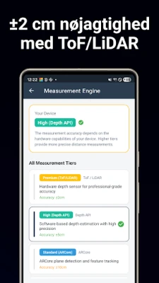Oplever du ofte usikkerhed, når du skal tage præcise mål i hverdagen eller på arbejdet? Denne app transformerer din enhed til et avanceret måleværktøj, der leverer enestående nøjagtighed, uanset din smartphones hardware. Vi har udviklet et dynamisk målesystem med fire niveauer for at sikre, at du altid får den bedste præcision muligt. På Premium-niveau udnytter vi din enheds indbyggede dybdesensorer (ToF/LiDAR) til at opnå professionel præcision ned til ±2 cm. For enheder med Dybde-API leverer vores Høje niveau softwarebaseret dybdeestimering med en imponerende nøjagtighed på ±5 cm. Selv med ARCore-understøttelse kan du forvente solide resultater på ±10 cm, og selv grundlæggende kameramåling er tilgængelig for alle.